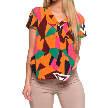 Ożyw swoją codzienną stylizację dzięki naszemu t-shirtowi, który łączy nowoczesny design z wyjątkowym komfortem. Zapinany przy dekolcie na guziki, ten t-shirt wyróżnia się pięknymi geometrycznymi wzorami w nasyconych kolorach, które przyciągają wzrok i dodają energii każdemu lookowi.